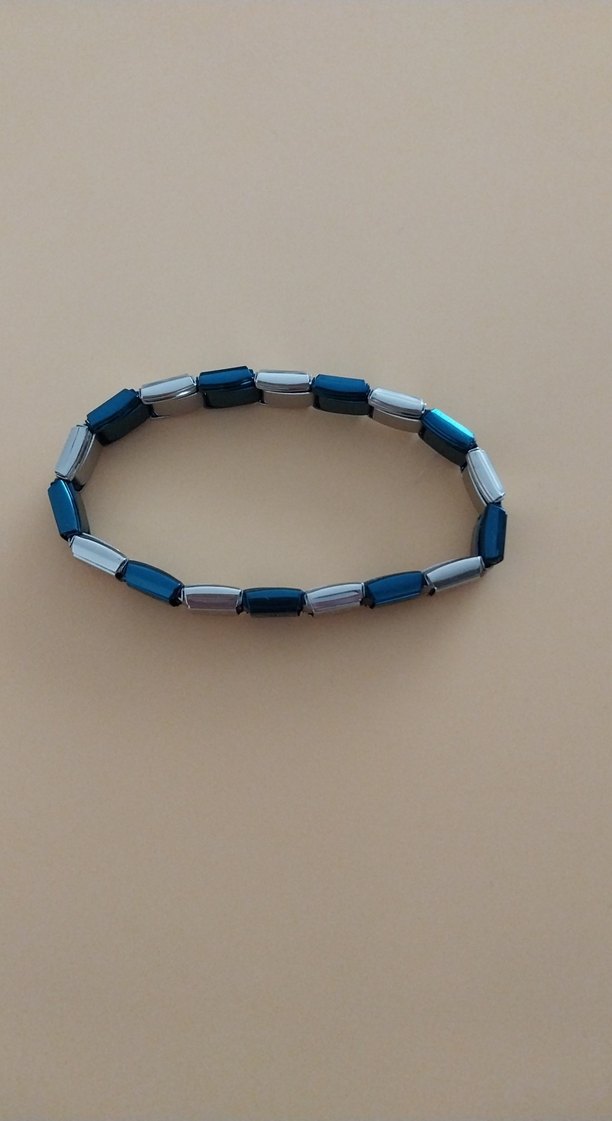 Mavi ve gri renklerde, elastik bantlı kadın bilekliği. Minimalist ve çağdaş tasarımıyla günlük kullanıma uygundur. Sade ve temel bir aksesuardır.