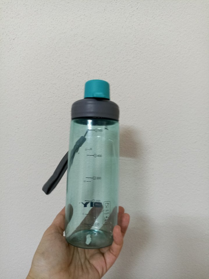 Mavi ve gri renklerde, ölçü işaretli ve tutma saplı Su Matarası. Taşıması kolaydır.