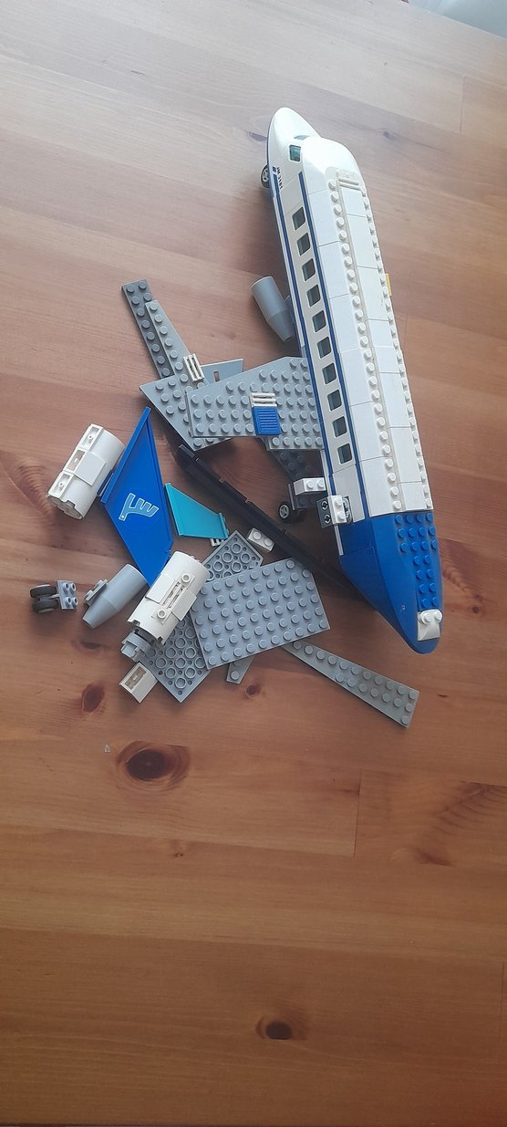 Uçak parçalarını andıran mavi ve gri Lego parçaları. Farklı şekil ve boyutlarda yapı taşları.