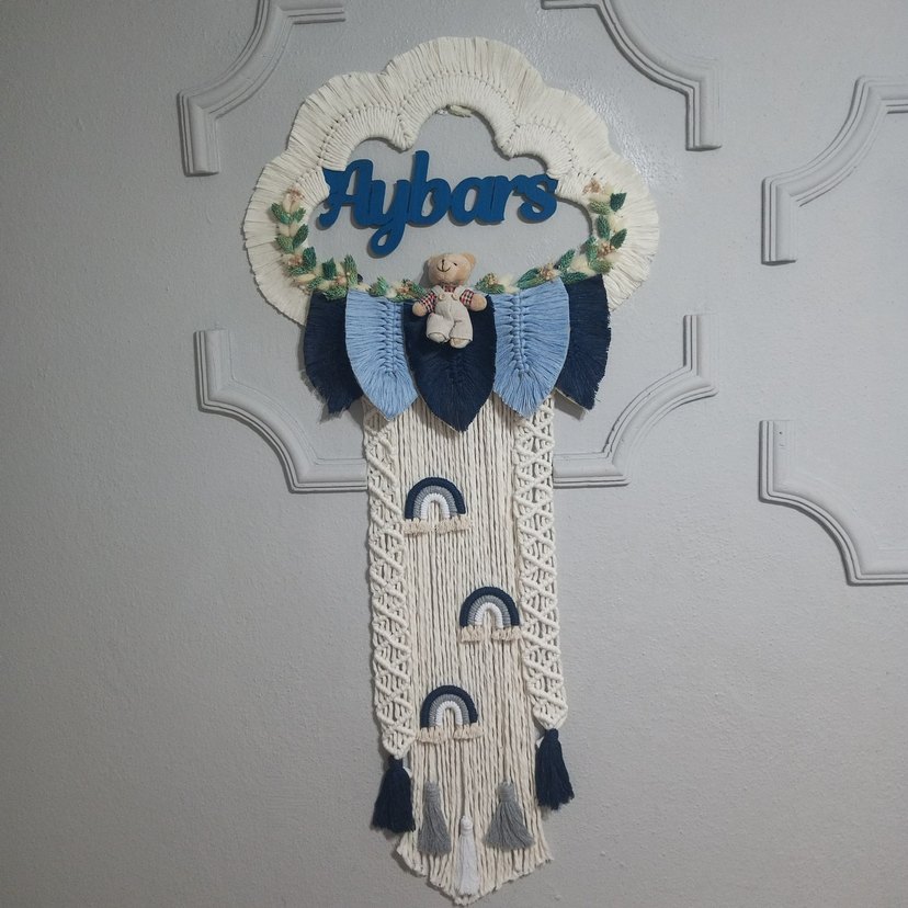 mavi ve gri tonlarda makrome duvar süsü, küçük bir oyuncak ayı ve dekoratif gökkuşakları içerir.