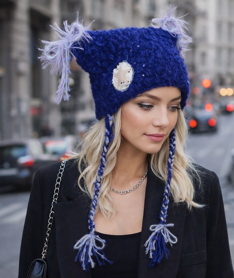 Mavi ve gri renklerde, örgü dokulu, saçaklı ve örgülü püsküllü bohem ve avant-garde tarzda kadın bere.