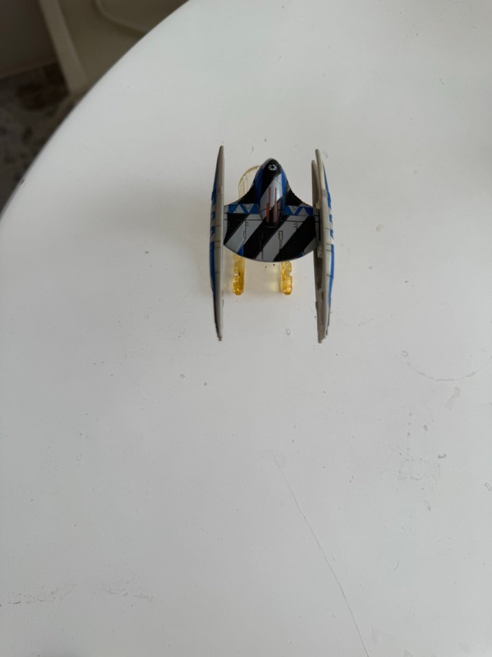 Mavi ve gri renklerde, benzersiz tasarıma sahip kompakt oyuncak araba.