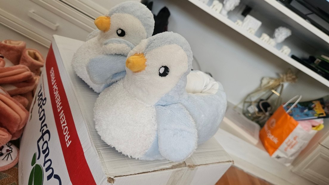 Mavi ve gri renklerde, yumuşak dokulu peluş penguen oyuncak, sarı gagasıyla sevimli görünüyor ev pandufu