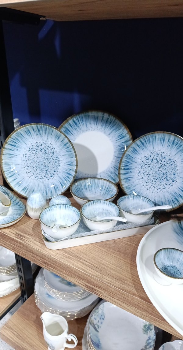 Mavi ve gri tonlarda, benekli desenli ve altın kenarlıklı seramik tabaklar ve kaseler. Küçük kaşıklar ve dikdörtgen tepsi içerir. ️