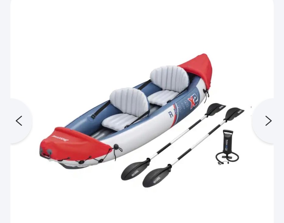 Mavi ve gri renklerde, iki yastıklı oturma alanı ve iki kürek içeren şişme kano sıfır kutusunda