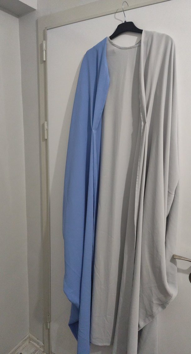 Kadınlar için mavi ve gri renklerde, uzun kollu, bol kesim ve desen içermeyen uzun elbise, minimalist ve çağdaş tarzda. ️