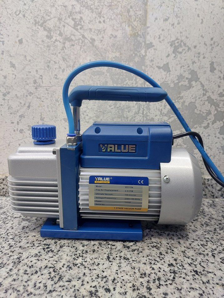 İhtiyaç fazlası sıfırdan farksızdır. Kenarda duruyor.Mavi ve gri renkte, sağlam saplı ve kompakt tasarımlı vakum pompası. Marka adı VALUE .kargoda sıvı akmaması için yağı boşaltılıp gönderilecektir. Sadece hortumu ve motor mevcuttur başka aparatı yoktur.