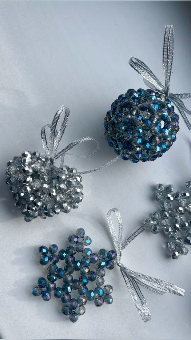 Renkli mavi ve gümüş ağaç süsleri, parlak boncuk tasarımları ve gümüş kurdelelerle. Tane 200 lira