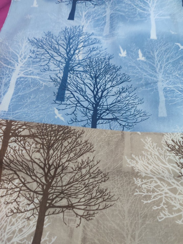Mavi ve kahve tonlarda ağaç desenleriyle basılmış nevresim ve çarşaf takım sıfırdan farksız bir kere kullandım iki takım çift kişilik her biri 2 yastık 1 düz çarşaf 1 adet 200 . 220 nevresim fermuarlı