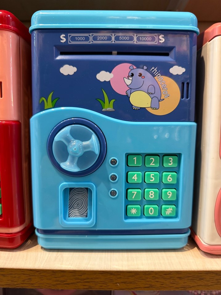 Mavi ve Kırmızı renkli, tuş takımı, döner kadran ve para girişi elektronik kumbara,kişiye özel belirlenebilen şifre özelliği bulunur.