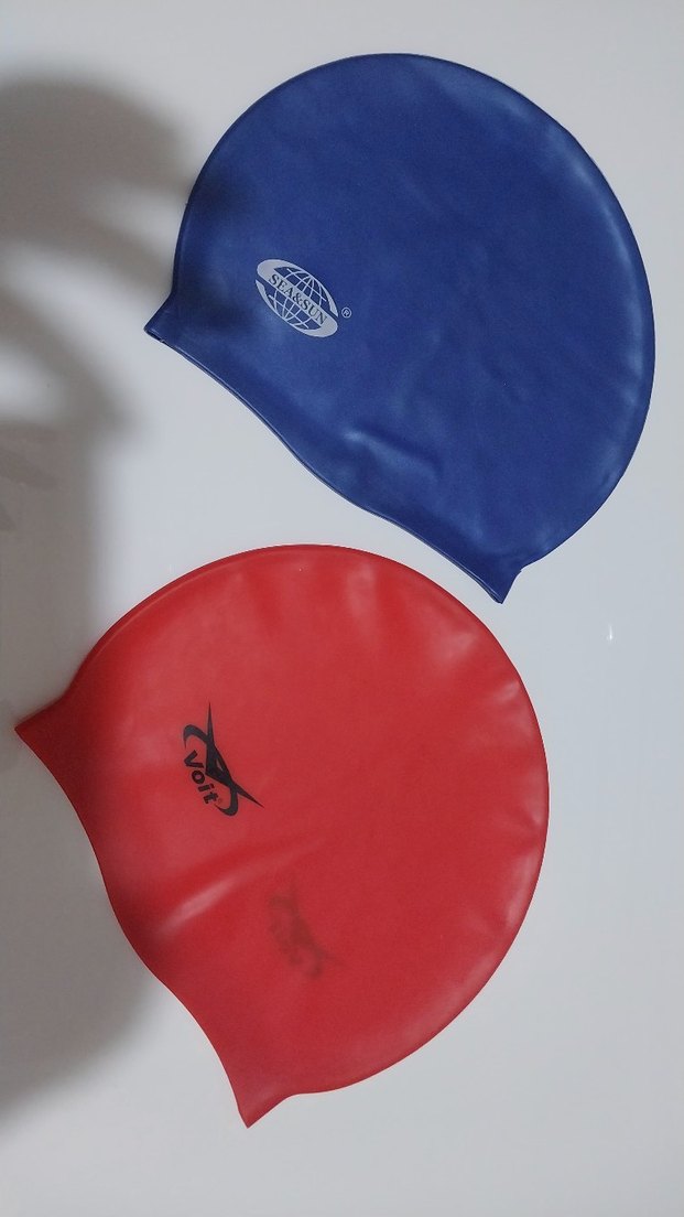 Mavi ve kırmızı silikon yüzme boneleri, elastik yapısıyla spor kullanımı için uygundur. Düz ve desensiz minimalist tarza sahiptir. ♂️