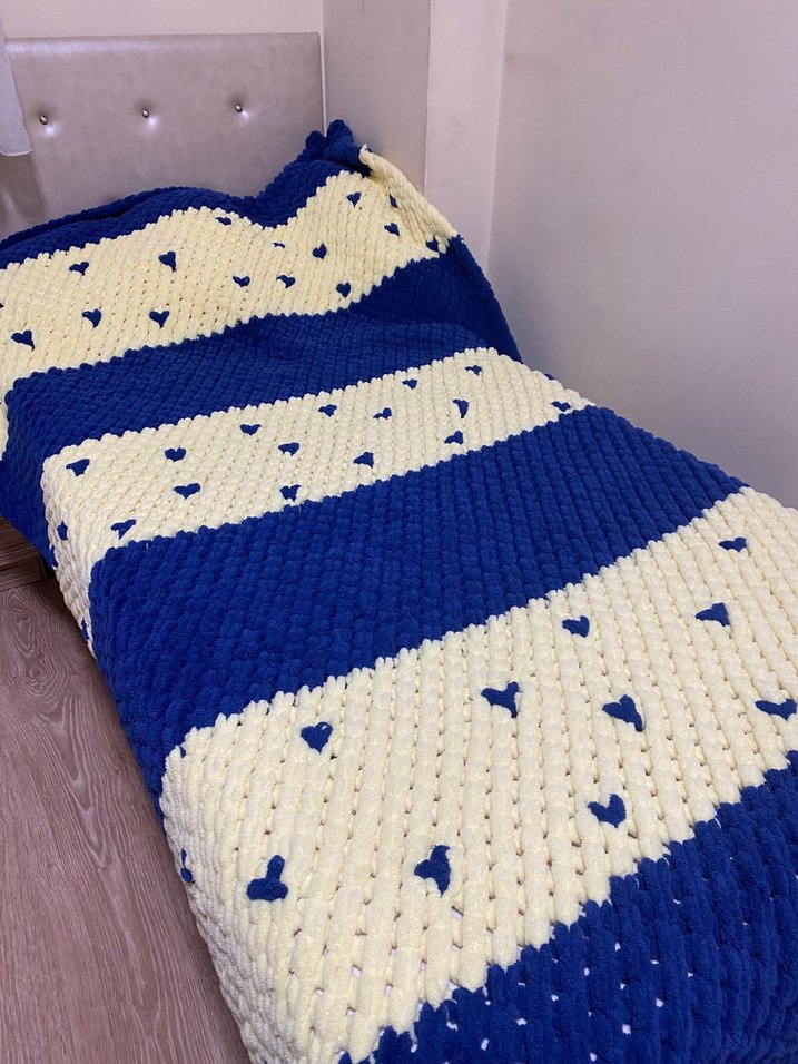 Mavi ve krem renklerde, küçük kalp desenleriyle süslenmiş yumuşak ve rahat bir battaniye. ️
