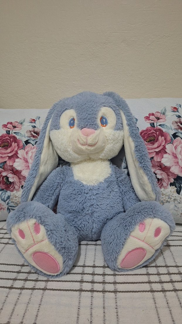 Yumuşak mavi ve pastel renkte, uzun kulaklı peluş tavşan oyuncak, işlemeli pembe pati detaylarıyla.