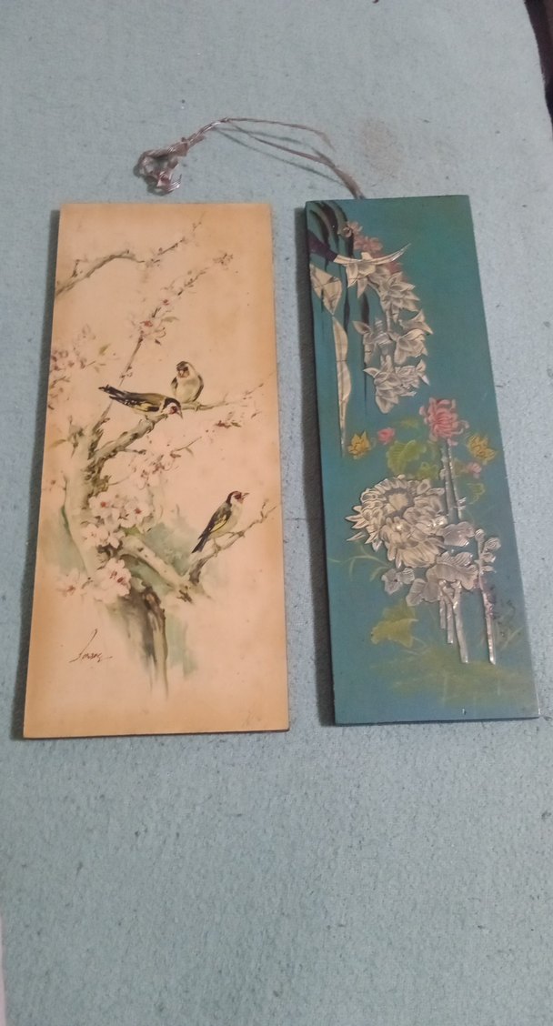 Pastel renklerde, biri kuşlu diğeri çiçek desenli, mavi tonlarda iki tablo. İkisi de asma ipine sahip.