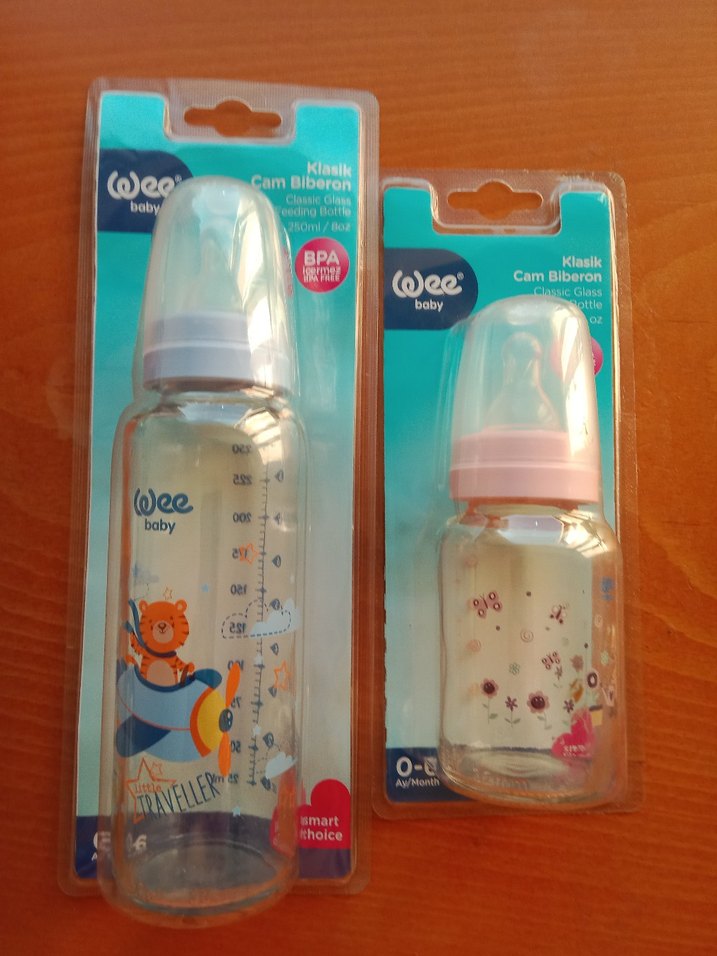 0-6 ay arası Mavi renkli ve pembe renkli wee baby, BPA içermeyen cam bebek biberonları. Güvenli besleme için ölçü işaretleri bulunur.