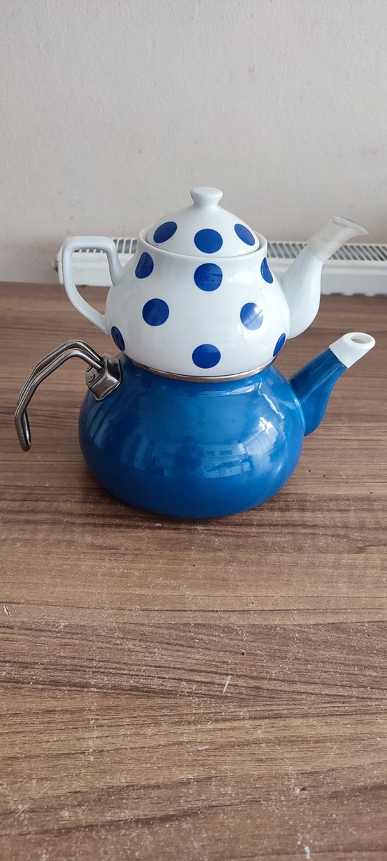 Alt kısmı mavi, üst kısmı mavi puantiyeli beyaz renkli çaydanlık seti. ☕ Altı hafif kireçlidir