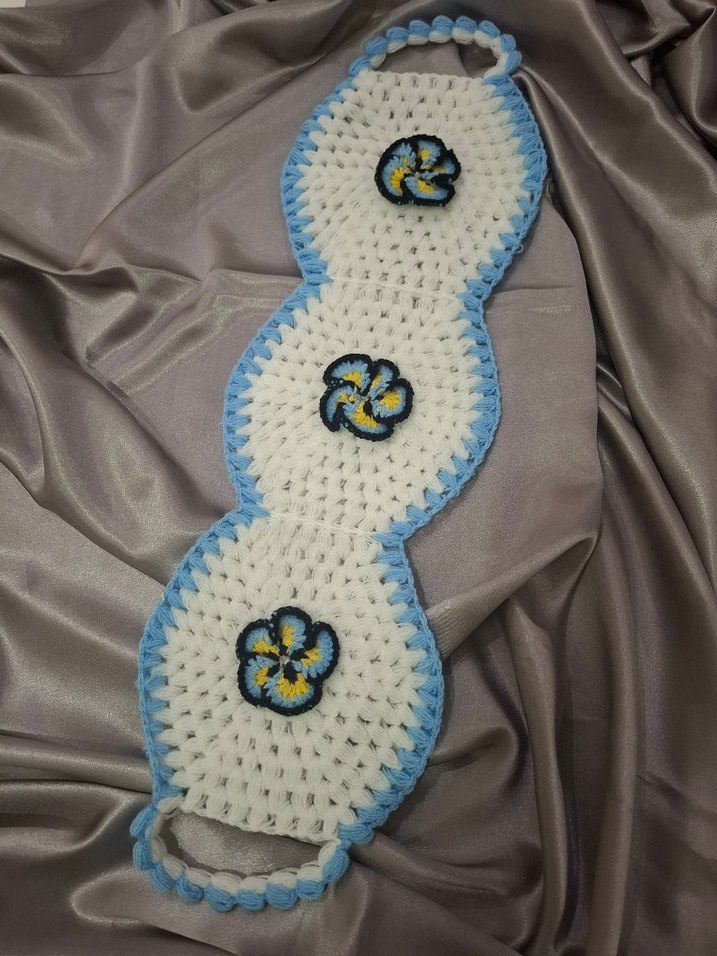 Yuvarlak beyaz taban üzerine mavi ve sarı çiçek desenleriyle örülmüş, yumuşak iplikten yapılmış el işi lif modeli.