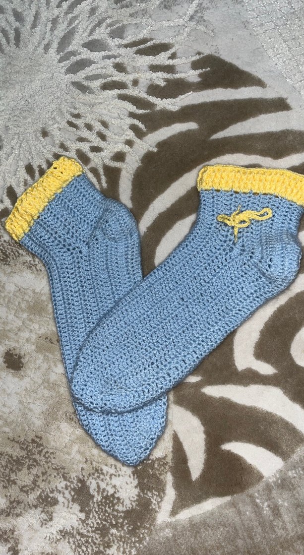 Mavi renkli, sarı manşetli ve küçük fiyonk detaylı erkek çorabı, yumuşak ve rahat dokuda. 40-41