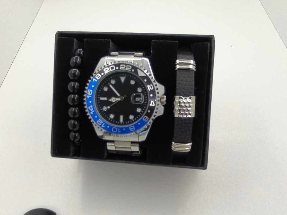 Koyu mavi ve siyah renklerde, metal kayışlı erkek saat. 24 saat göstergeli bezel ve parlak göstergeleri var. Biker tarzı uyumlu bilekliklerle birlikte. ⌚
