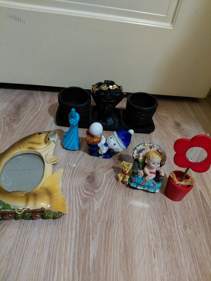 Koyu mavi ve siyah tonlarda figürin seti; balık çerçeve ayna, mavi büyücü, beyaz top taşıyan palyaço, ayıcıklarla kız ve kırmızı çiçekli saksı içerir.