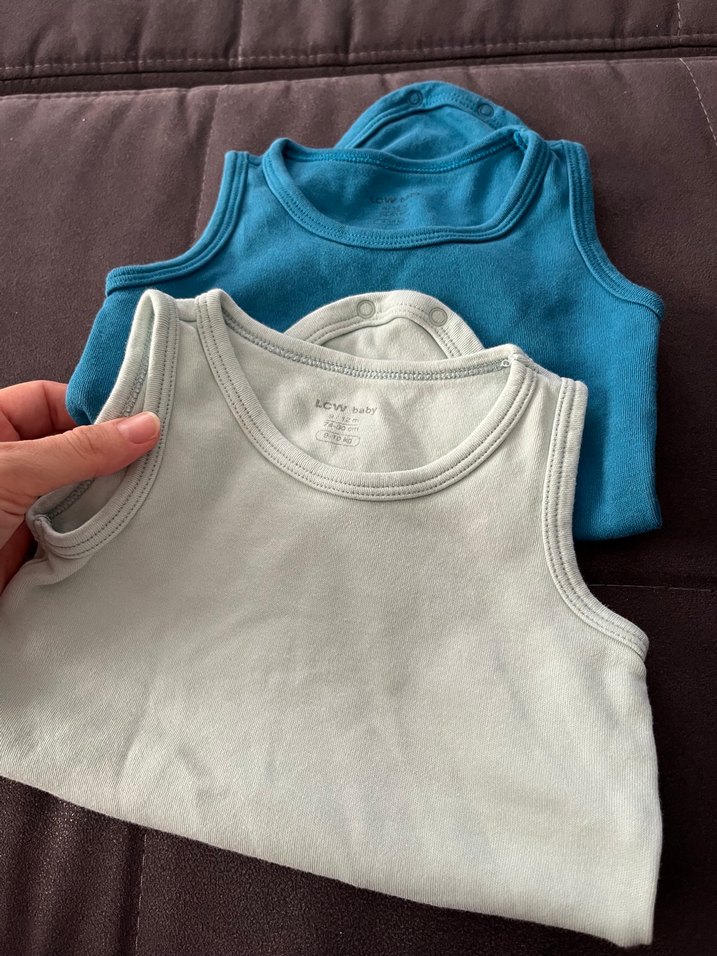 Mavi ve su yeşili renklerde, yumuşak ve rahat kumaştan yapılmış iki çocuk zıbını. Sıcak havalarda katman olarak kullanılabilir.