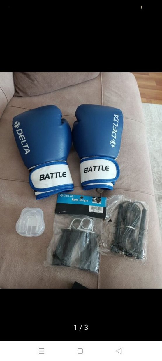Koyu mavi renkte, Velcro bağlamalı erkek boks eldiveni. Plastik malzemeden üretilmiş, baskılı desenli ve BATTLE ile DELTA markalı. Set halindeki fiyatıdır 6 parçadan oluşur hepsi fiyata dahil denemek icin bile kullanılmamistir. hevesle alındı ve kenarda kaldı