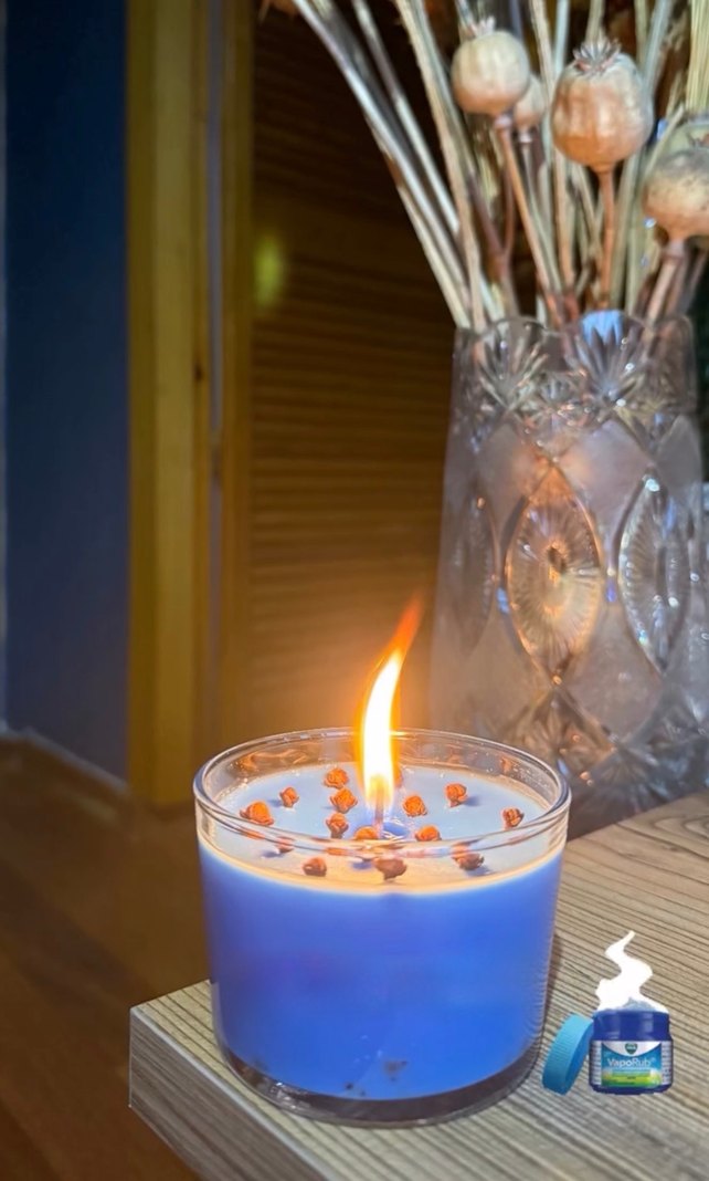 Cam kasede , Vicks kokulu mumun üzerinde karanfil detayları bulunan açık mavi mum, sıcak bir ortam sağlarken nane kokusu rahat nefes almanızı sağlar. Doğal soya wax kullanılmaktadır. Cam kasede istenilen renk ve farklı kokularla mum çalışması yapılabilir , seçebileceğiniz kokular ikinci fotoğrafta mevcuttur. Diğer kokularda fiyat farklı olacaktır , iletişime geçmeniz yeterlidir.