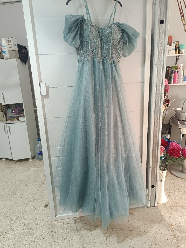 Mavi, uzun ve vücuda oturan bu abiye, askılı straplez yakası ve nakışlı detayları ile pastel bohem tarzında, düğünler için uygun. ürün sıfır hiç kullanılmadı tarlatanı mevcut tarlatan boyu 105 cm tarlatan genişlik 210 cm
