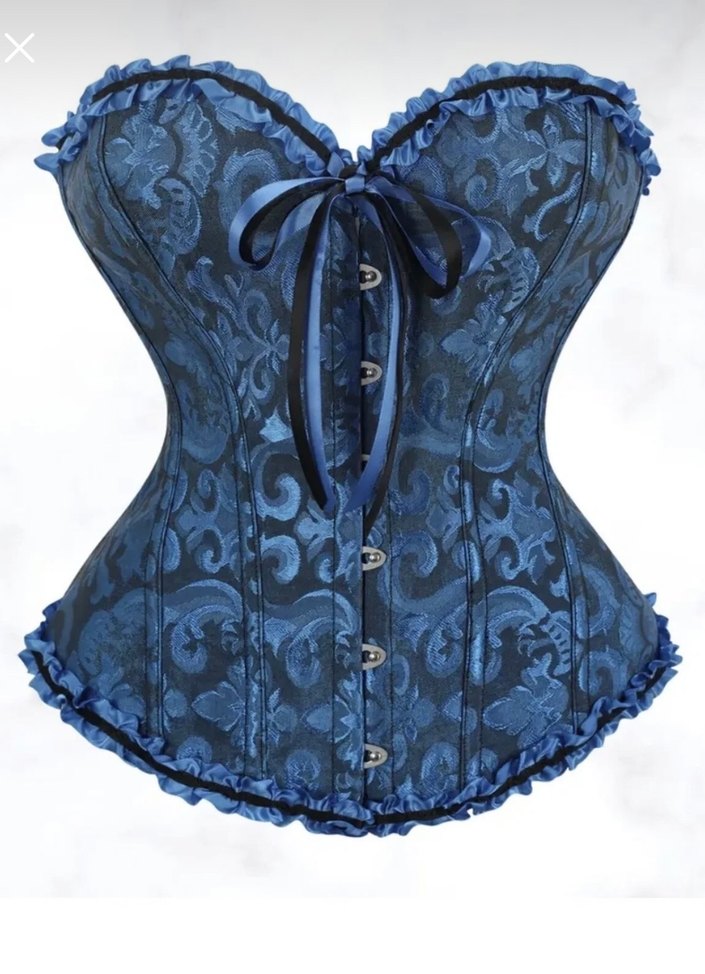Düğmeli, straplez ve vücuda oturan bu bustiyer, koyu mavi sentetik kumaş ve nakışlı desenlerle kostüm partilerine uygundur.