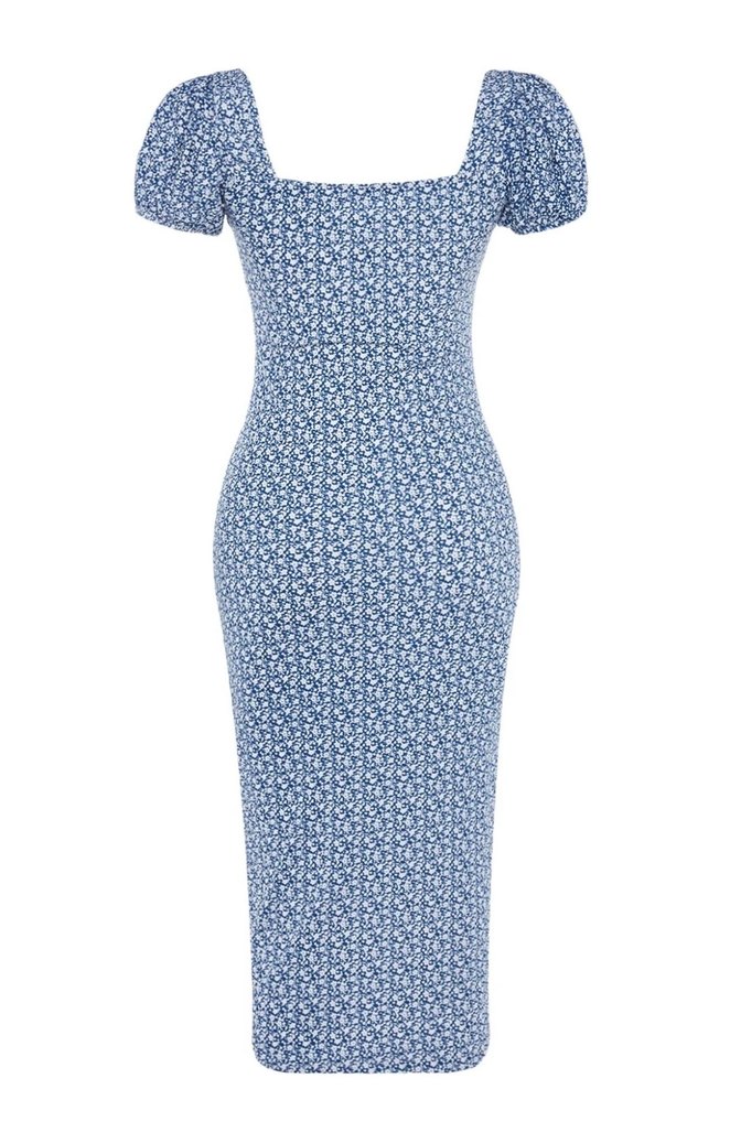 Dar kesim midi elbise, kısa kollu, yırtmaç detaylı ve kare yakadır. Yumuşak sentetik kumaştan üretilmiş, vintage tarzında ve çiçek desenlidir.