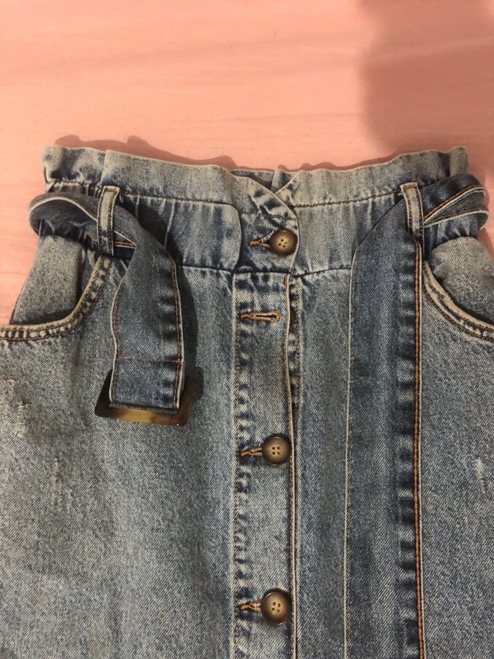 Mavi denim midi etek, tokalı kemer ve düğmeli ön detaylara sahip. Gevşek kesimi ve vintage tarzıyla günlük kullanıma uygun, yumuşak ve rahat kumaşlıdır. hiç giyilmedi