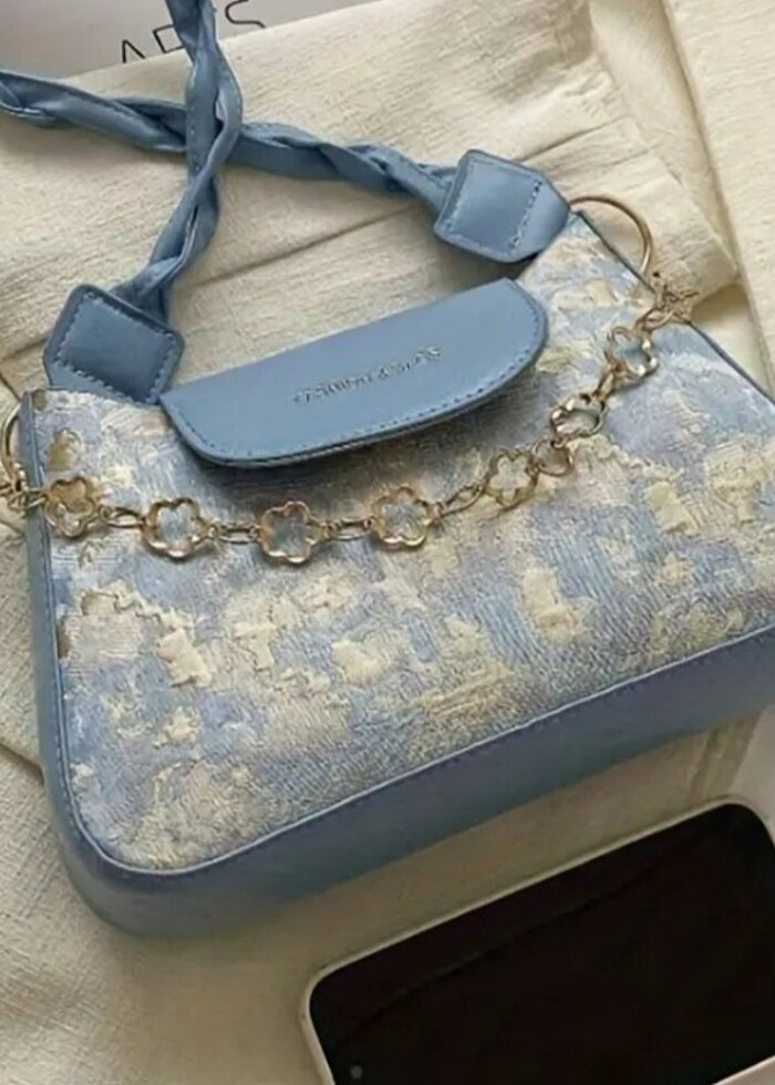 Mavi vintage yağlı boya desenli omuz çantası