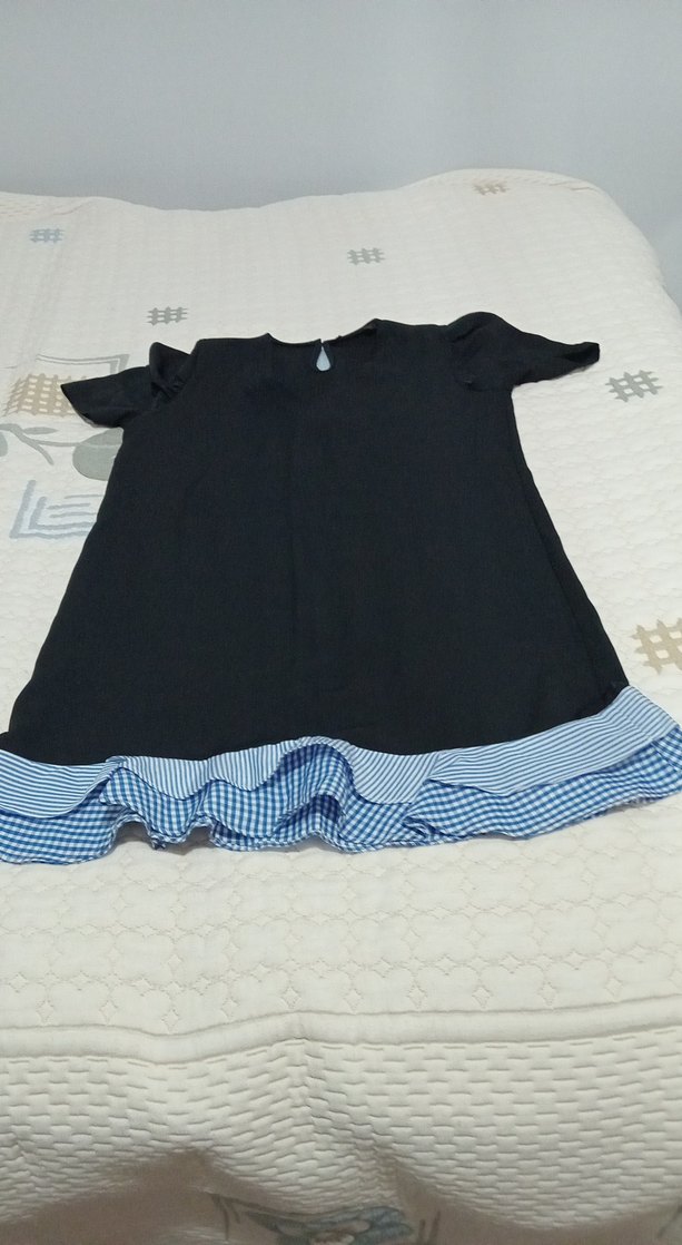 Kısa kollu, bisiklet yaka ve rahat kesimli elbisesi. Mavi ekose desenli volanlı etek ucu ve midi boy uzunluğu bulunur. Günlük rahat kullanım için uygundur.