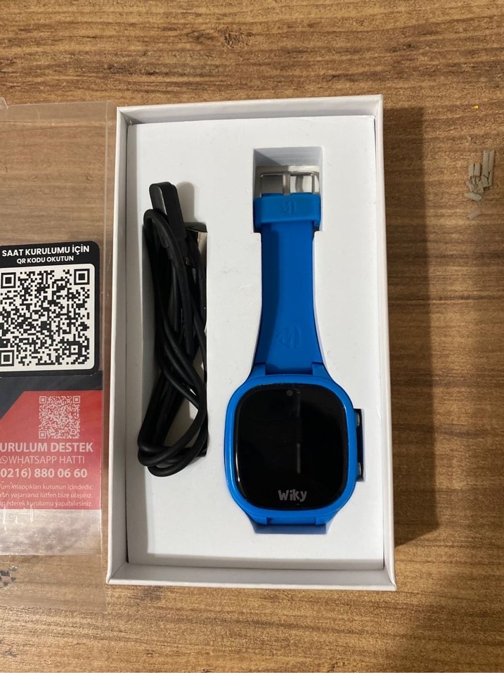 Wiky marka koyu mavi kayışlı akıllı saat ve şarj kablosu ile birlikte gelir. Kutuda destek bilgileri yer almaktadır.⌚ birkaç kez kullanıldı çocuğum kullanmak istemedi garantisi devam ediyor Turkcell’den alındı