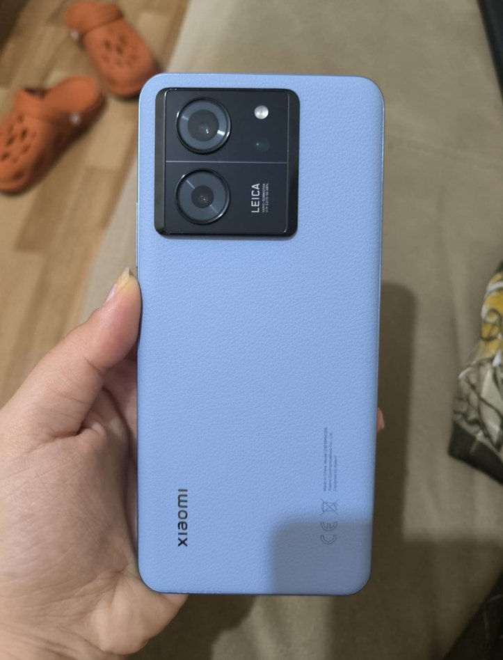Mavi pastel renkte, dokulu arka yüzeye sahip Xiaomi Android telefon, çift Leica kamera ile donatılmıştır.