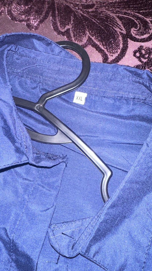Yumuşak kumaştan yapılmış mavi XXL gömlek, gri askıda. Rahat kesim ve detaylı dikişler içerir.