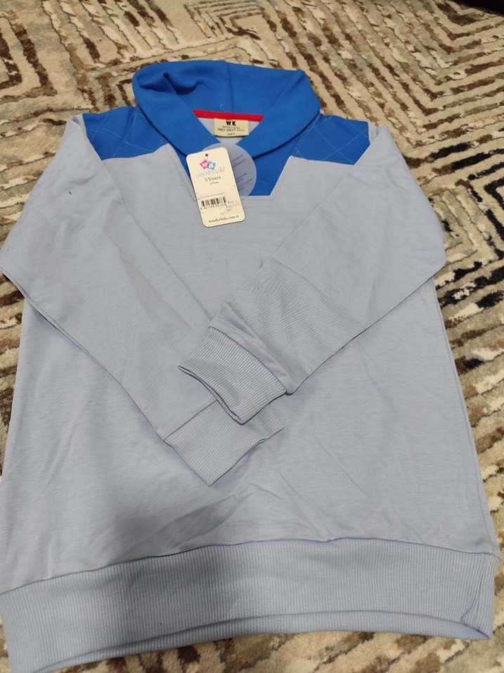 Mavi ve gri renkte, uzun kollu, yakalı ve örgü dokulu, rahat kesim erkek sweatshirtü. bes yaş ve 8 yasa uygun ikili satista
