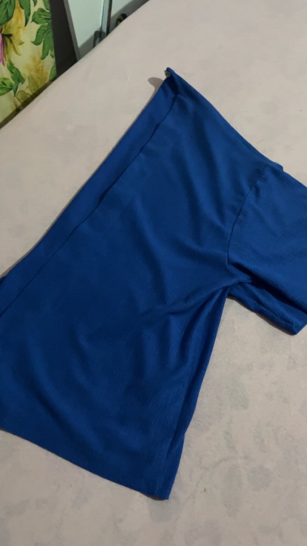 Mavi renkte, yaka detayı ve kısa kollu, bol kesim hamile tişörtü. Parlak sentetik kumaştan, günlük kullanıma uygun drapeli tasarım.
