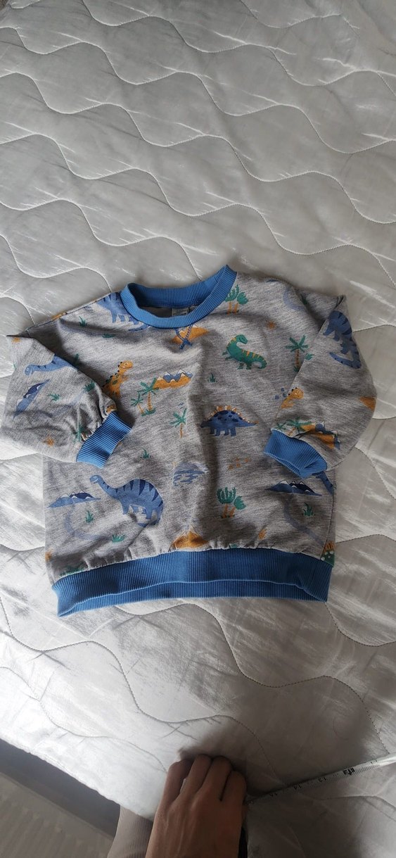 Gri zemin üzerine renkli dinozor desenleri bulunan, mavi yaka ve paça detaylı, uzun kollu, bol kesim çocuk sweatshirtü. Yumuşak ve sıcak kumaştan üretilmiştir.
