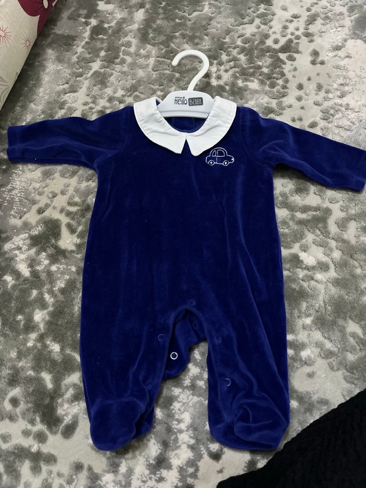 Beyaz yakalı, uzun kollu mavi bebek tulumu. Üzerinde küçük araba deseni ve kolay giydirme için düğmeler bulunur.