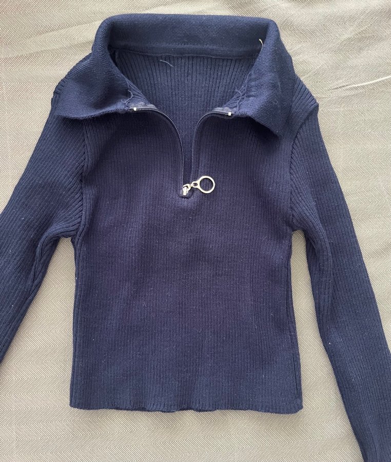 Mavi renkli, yakalı ve yarım fermuarlı, triko dokuma kadın kazak. Uzun kollu ve midi boyda, rahat sokak stili için uygun bir parça. Crop tarzındadır.