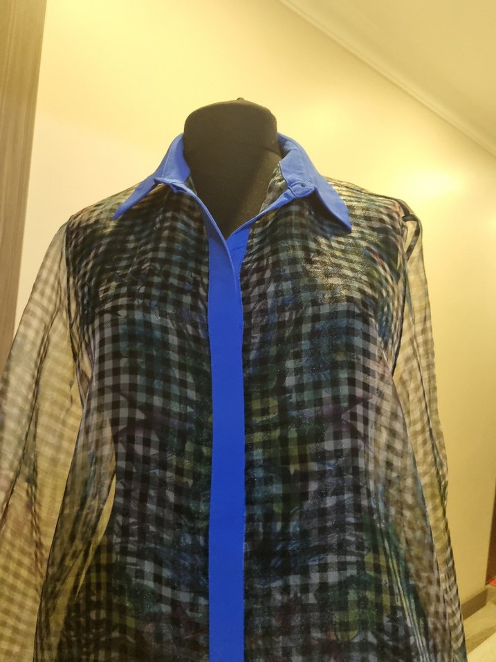 Mavi yakalı, uzun kollu, dökümlü ve bol kesim gömlek, şeffaf kumaş üzerinde koyu tonlarda batik desenle çağdaş ve avangart tarzı bir araya getiriyor.