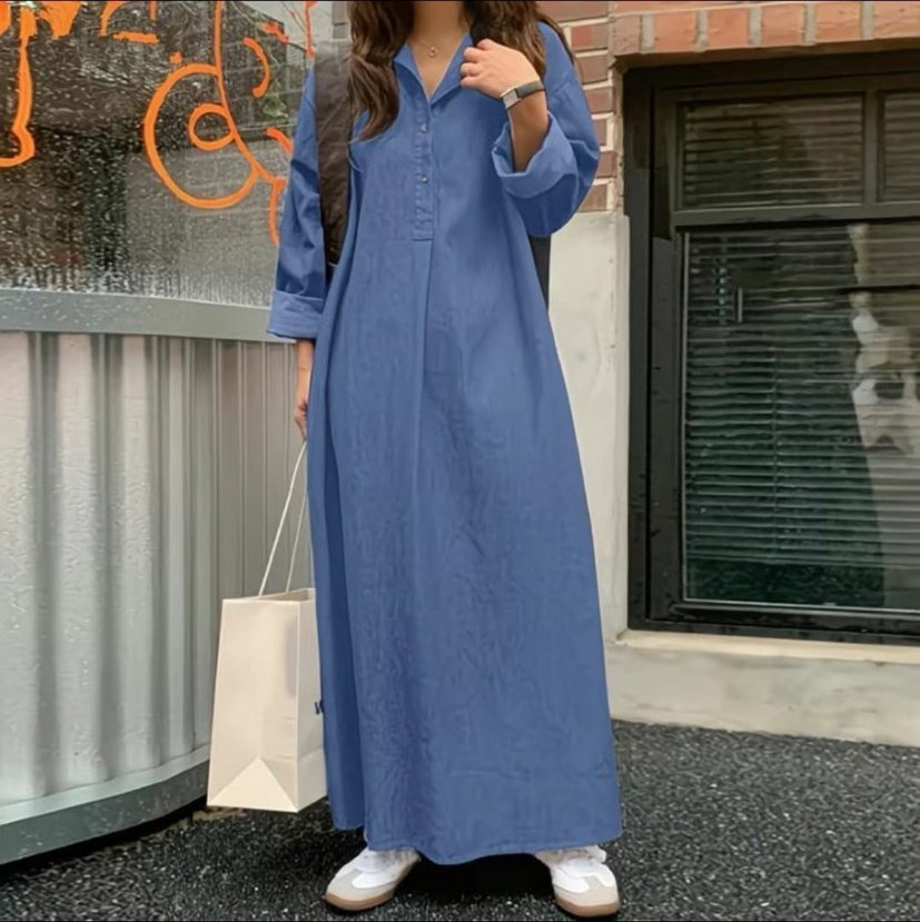 Mavi renkte, yumuşak incecik kumaştan yapılmış, yarım yaka düğmeli ve uzun kollu uzun elbise. Salaş kesimine sahip, tiril tiril kumaş sayesinde yaz ayları için uygundur. Elbisenin orijinal hali yırtmaçsızdır, sonradan açılan iki yan yırtmacı mevcut. Orijinal hale getirilmesi için terzi tadilatı gereklidir.