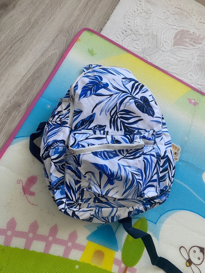 Mavi yaprak desenli, sentetik kumaştan, fermuarlı bölmeleri olan kadın sırt çantası, günlük kullanım için uygundur.