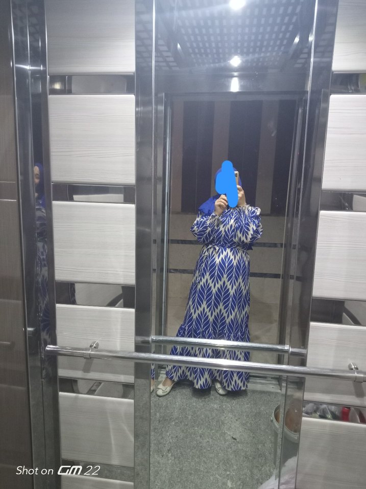 Uzun, bol kesim elbise yüksek yakalı ve uzun kolludur. Mavi ve gri yaprak desenli, bohem tarzı yansıtır.şalınıda veriyorum
