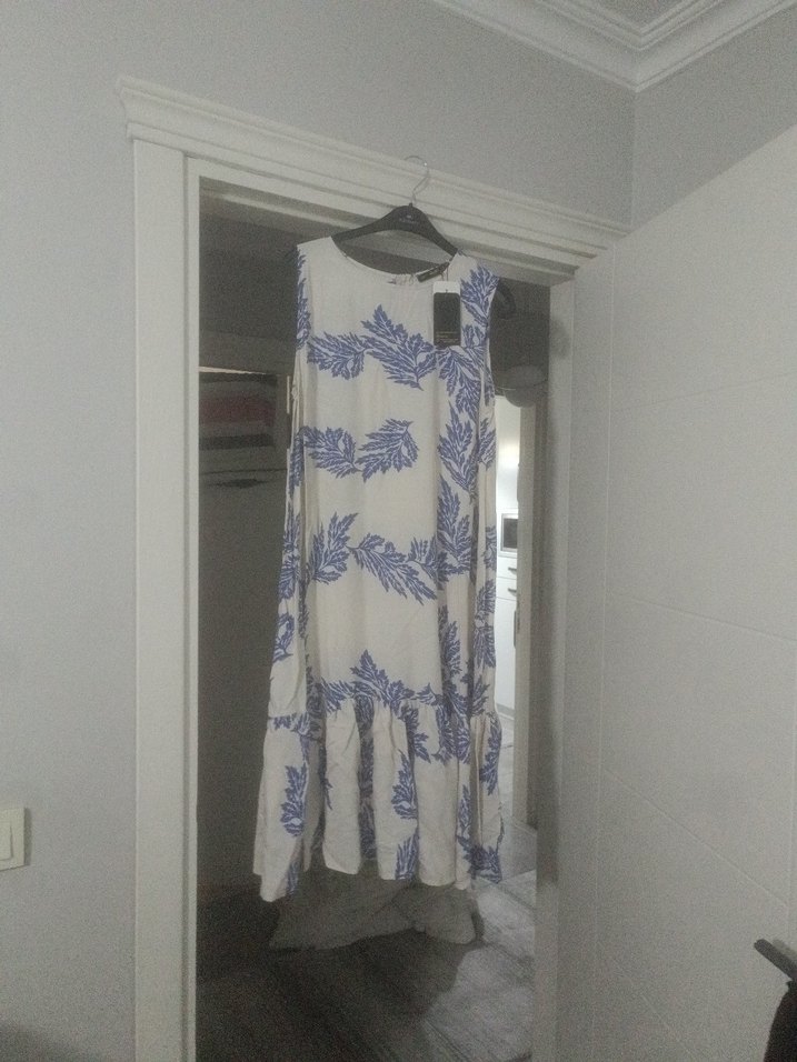 Mavi ve gri tonlarda yaprak desenli, kolsuz, bol kesim uzun elbise. Askısız yaka ve drapeli kumaşıyla bohem tarzda, günlük kullanıma uygun.