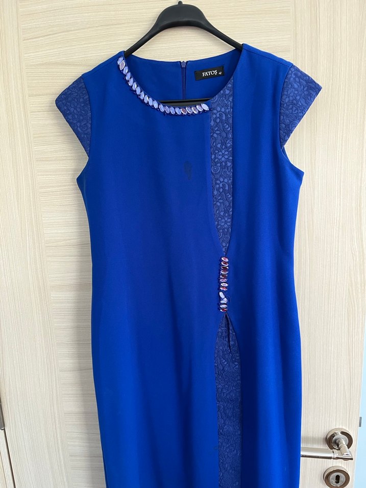 Mavi, yarı boy kadın elbisesi kolsuz ve V yaka. Düzenli kesim, saks mavisi boy 103 cm ön kısımda tek lekesi mevcut yıkanınca çıkacaktır beden 42 dir