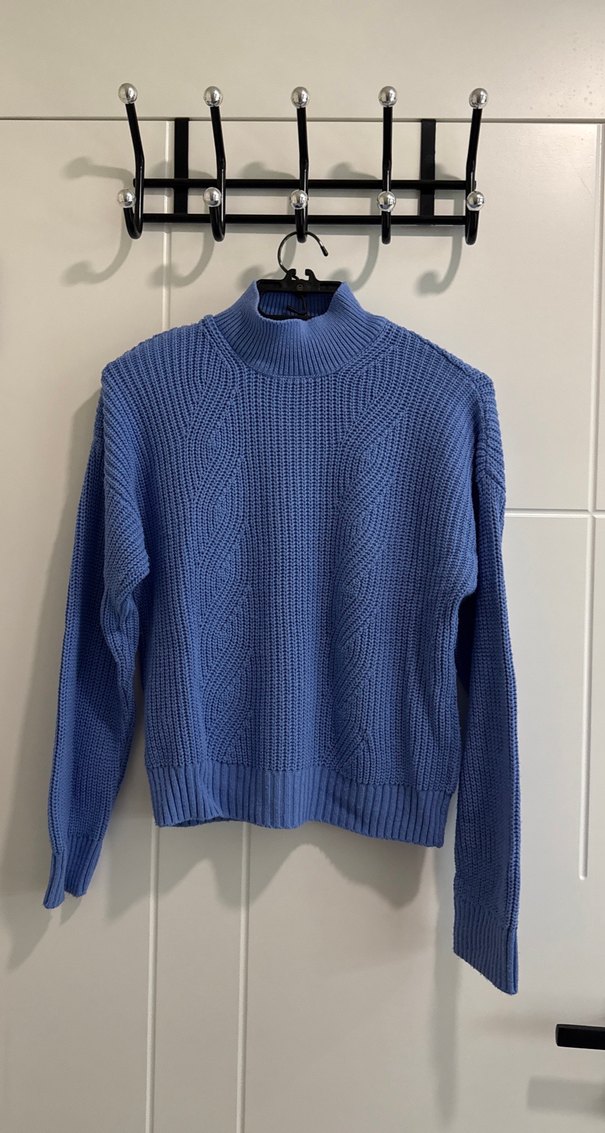 Yarım balıkçı yaka ve uzun kollu, mavi pastel renkte örgü kadın kazak. Rahat ve sade tasarımıyla günlük kullanıma uygun, normal boyda ve kesim. Xs ve S bedene uyumludur 12-13 yaş kız çocuk da tercih edilebilir beden uyumlu olacaktır. Defacto markadır. Rengi farklı ışıklarda çektim çok koyu olmayan pastel tonlarda bir mavi.