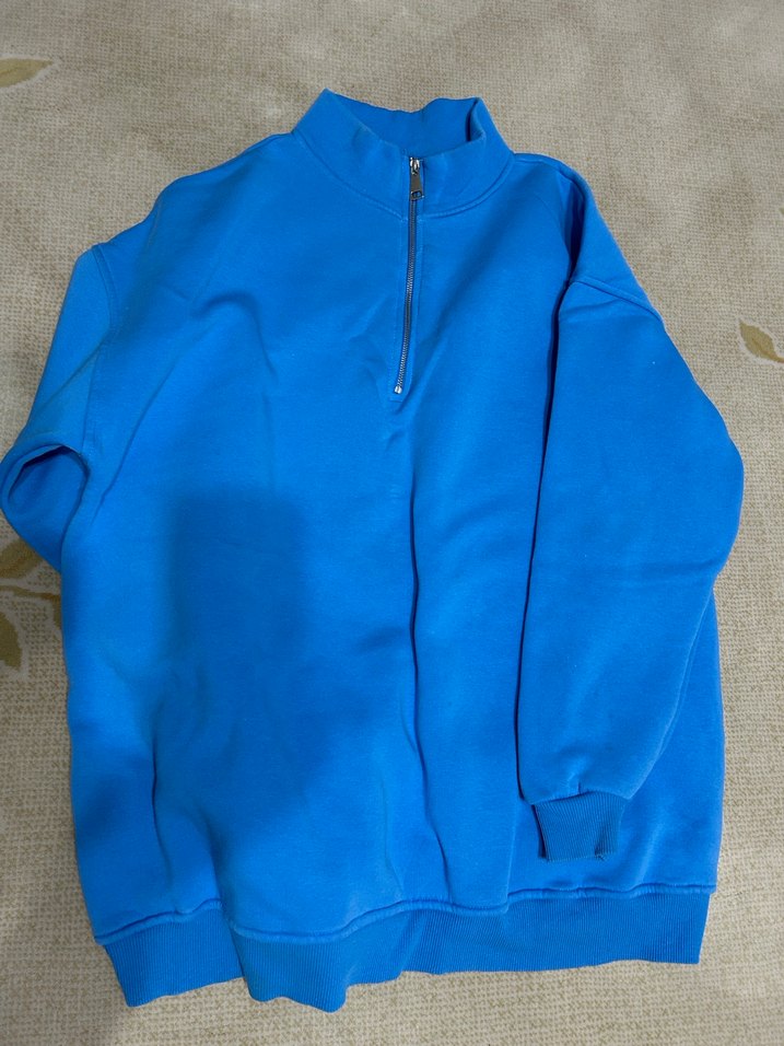Mavi, parlak görünümlü kadın sweatshirt, uzun kollu ve yarım fermuarlı yüksek yaka tasarıma sahiptir. Rahat kesim ve normal boydadır, yumuşak ve sıcak kumaştan üretilmiştir.