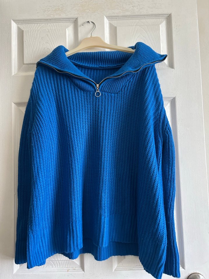 Parlak mavi renkte, yarım fermuarlı yüksek yakalı, uzun kollu ve bol kesim midi uzunluğunda triko kazak.